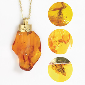 Anhänger. 800/000Silber vergoldet, Bernstein mit 3 Fliegen !, Kette verg., L = 62 cm, total 9,4 g (ohne Kette)
