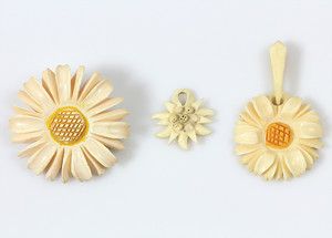 Lot, Schmuck aus Bein, 30er Jahre, 2 Anhänger, 1 Brosche teilweise farbig bemalt, kl. Edelweiß (ohne Schlaufe), D = 19 mm, 2 St. Margeriten, kl. D = 27,5 mm, gr. D = 36,5 mm