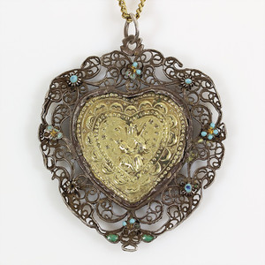Rosenkranz um 1880-1900 süddeutsch, Silberzwischenteile, 1 Silberanhänger mit kl. goldenem Marienbild, Silber 800/000 verg. farbiges Marienbild (Italienische Punze), olivenförmiges weißes Glas, L = ca. 37 cm