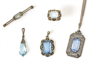 Rosenkranz süddeutsch, leuchtend blaues facettiertes Glas (Gablonz), aufwendige Silberzwischenteile mit. kl. Anhänger, silberner Abschlußanhänger beidseitig mit bemaltem Glaskreuz, L = ca. 42 cm