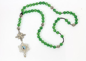 Rosenkranz süddeutsch, leuchtend grünes facettiertes Glas (Gablonz), Silberzwischenteile u. Anhänger ( 1 x mit bemaltem Glaseinsatz), L = ca. 28 cm