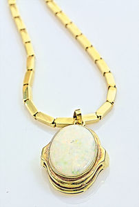 Collier, Opalanhänger, GG 333/000, Opal 12 x 16 mm, H = 29,5 mm, Collier, GG 585/000, kl. Kastenschloss mit Sicherheitsacht, L = 42,5 cm, alles total 15,4 g