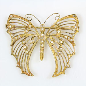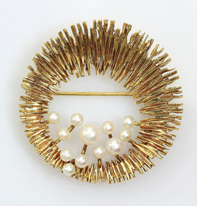 Brosche, GG 585/000, 12 Akoja-Perlen ca. 2,8- 4,5 mm, Brosche D = 35 mm, total 6,9 g