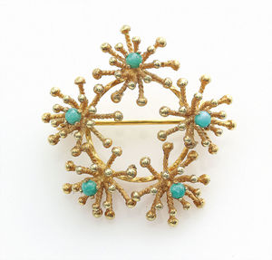 Brosche, GG 585/000, 5 grüne Cabochons, Brosche D = 31,3 mm, total 6,1 g