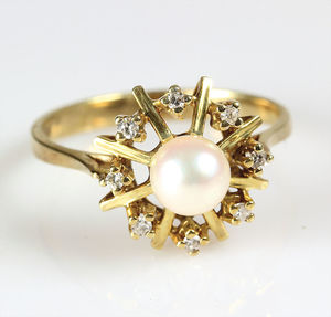Ring, GG 585/000, Akoja-Perle 6,0 mm, 8 Diamanten ca. 0,010ct weiß, RW ca. 58