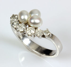 Ring, WG 585/000, 3 Biwa-Perlen, 7 Brillanten/ Diamanten ca 0,5 ct w-si/p, RW ca. 54