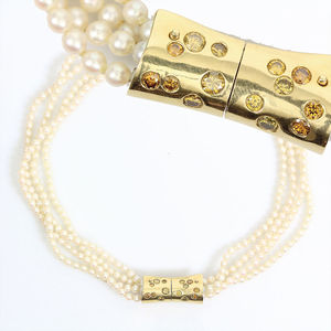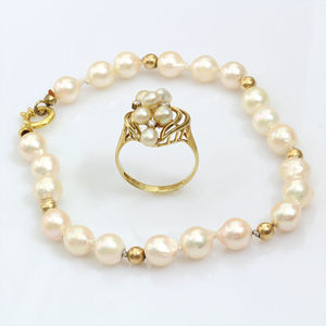 Lot: Ring GG 585/000, 6 Biwaperlen, 3 Brillanten w-p, RW ca.52, Armband GG 585/000, Akoja-Perlen, L = 21,5 cm