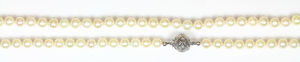 Perlenkette, Kugel-Schließe D = 13,5 mm, WG 585/000, 18 Brillanten ca. 0,30 ct weiß-si, Akoja-Perlen D = 7,5 - 8,0 mm, L = 60