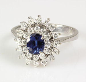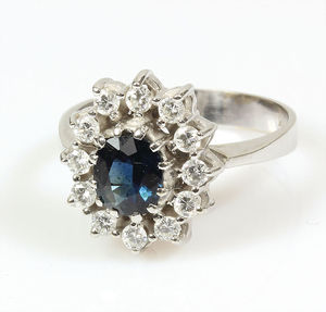 Ring, WG 585/000, Saphir fac. ca. 0,80 ct, 13 Brillanten ca. 0,5 ct w-si, RW ca. 57,5