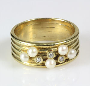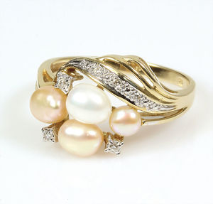 Ring, GG 585/000, 4 Süßwasser-Perlen, 6 Diamanten weiß, RW ca. 54