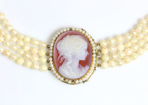 Kette gedreht, Schließe Metall vergoldet, 3 reihige Biwaperlkette mit Astkoralle und verg. Kugeln, L = 73 cm