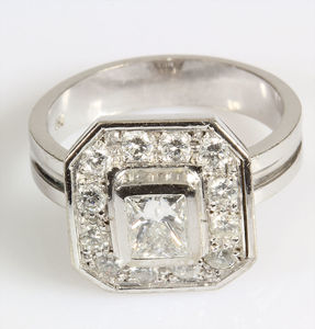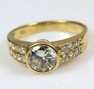 Ring, GG 750/000, zentraler Brillant ca. 1,3 ct, leicht getöntes weiß - lupenrein, seitlicher Besatz: 12 Brillanten ca. 0,25 ct tw-vsi, RW ca. 54,5