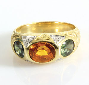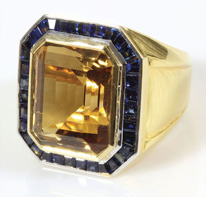 Ring, GG 750/000, Citrinachteck ca 20 ct, 34 Saphire ca. 4,35 ct, RW ca. 64, total 27,6 g