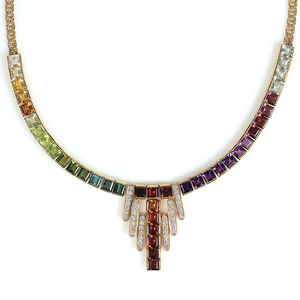 Collier, REGENBOGENFARBEN", GG 750/000, 42 Brillanten ca. 1,0 ct w-si, 39 verschiedene Edelsteine: Granat, Aquamarin, Turmalin, Amethyst und Citrin alle als Carré geschliffen 4,5 x 4,5 mm, Kastenschloss mit Sicherungsacht, Fassungen sind beweglich miteinander verbunden, L = 38 cm, total 36 g,