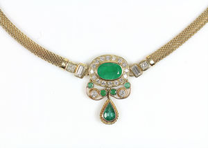 Collier, ITALIEN, GG 585/000, 1 großer ovaler Smaragd ca. 4-4,5 ct ct (13 x 9 mm), 1 leuchtender facettierter Smaragdtropfen ca. 1,6 ct, 4 runde Smaragde 0,60 ct, 2 Princess Diamanten, 2 Diamantbaquettes, 16 Brillanten, 2 Brillanten, L = 50 cm, total 54,8 g