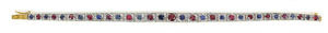 Armband, GG 750/000, 17 Rubine u. farbige Saphire (blau/ gelb) ca. 4,5 ct, 4 Smaragde ca. 0,8 ct, 1 grüner Granat ? ca. 0,5 ct, 21 Brillanten ca. 0,90 ct. tw/w- si, ein Band mit buntem Farbenspiel, Kastenschloss mit Schnepper u. 2 Sicherungsachten, L = 18,5 mm