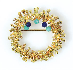 Brosche 60er Jahre, GG 585/000, 3 Türkis-, 2 Lapiskugeln, D = 28,0 mm, total ca. 6,3 g