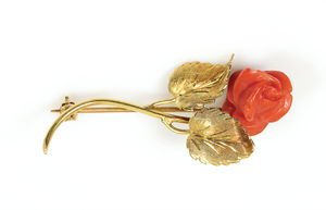 Brosche "ROSE", GG 750/000, geschnittene Korallenblüte, L = ca. 42 mm