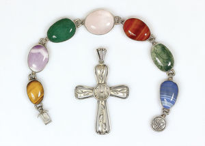 Lot: Armband Silber 835/000, verschiedene Achatcabochons, Tigerauge, Kastenschloß mit Schnepper, L = 21 cm; Kreuz Silber 800/000, H = 61 mm