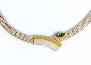 Collier, Fa. "MANU", Silber 925/000, Feingoldfassung u. Belötung, Turmalinnavette im Cabochonschliff ca. 1,1 ct, 3-fach Fuchsschwanzkette, L = 42 cm