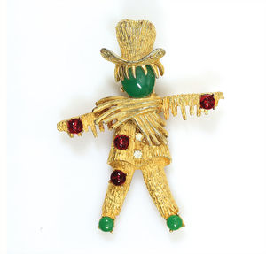 Goldfarbene Brosche von Florenza (signiert). Plastische Darstellung einer Vogelscheuche mit roten und grünen Glascabachons.