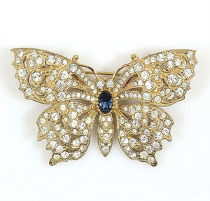 Goldfarbene Brosche in Form eines Schmetterlings. Fein gearbeitet, durchbrochenes Muster, Strassbesatz und mittig ein ovaler, blauer Strassstein. Signiert A & S (Attwood & Sawyer, England).