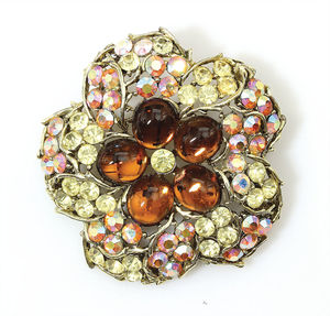 Brosche in Blütenform von WEISS USA (signiert). Innen 5 braune Glascabochons;außen zahlreiche Strasssteine in zarten Farben. Goldfarbene Fassung. D = 55 cm