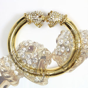 Glänzender, massiver Panther-Armreif (unsigniert). Goldfarben. Mit zwei plastisch geformten Panther-Köpfen, üppig besetzt mit klarem Strass. D innen ca. 61 x 46 mm