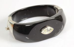 Schwarze Kunststoff-Armspange, in der Mitte mit einem klaren, geschliffenen Navette-Stein. Verschluss und Gelenk aus 925er Silber. D innen ca. 60 x 54 mm