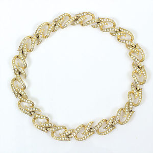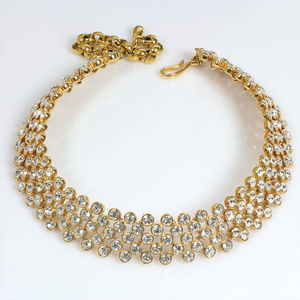Üppiges, goldfarbenes Strass-Halsband mit zahlreichen runden Steinen. Unsigniert. Verlängerungskettchen und Hakenverschluss. L = 41 cm