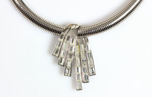 Silberfarbenes Collier von D'ORLAN (Paris). Halsnahe Schlangenkette mit festem Anhänger, besetzt mit klaren Navette-Steinen. L = 42 cm