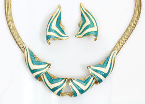 Set: Ohrclips und Collier. Sig. HR Paris (Helena Rubinstein). Goldfarbenes Metall mit fröhlicher, "gestreifter" Emaille-Auflage in Cremeweiß und Türkis. Elemente/Glieder in geschwungener, dreieckiger Form. L = 43 cm