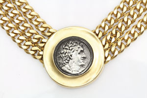 Massives, goldfarbenes Collier von Erwin Pearl (sig. auf der Rückseite des Mittelteils). 3-strängige Gliederkette mit der Nachbildung einer röm. Münze als Mittelteil. Gesamtlänge 42 cm