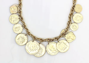 Collier, Franklin Mint. Karibik-Halskette mit 14 Münzen (mit 24 kt Goldüberzug). Jede Münze ist die offizielle Ausgabe einer der Karibik-Nationen. Sammlerstück mit Echtheitszeugnis. L = 45 cm