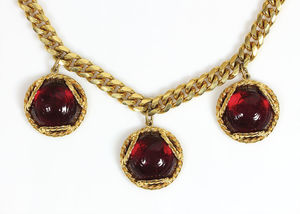 Massive goldfarbene Gliederkette mit 3 großen, runden Anhängern besetzt mit einem roten, eingefassten Glascabochon. Unsigniert. L = 45 cm