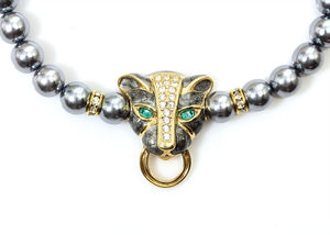 Panther-Collier signiert KJL for AVON (Kenneth Jay Lane). Anthrazitfarbene Kunstperlen; in der Mitte ein emaillierter, strassbesetzter Pantherkopf. L = ca. 45,5 cm