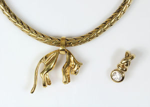 Lot: Collier, Metall vergoldet, Fuchsschwanzkette rund D = 5mm, L = 50 cm, Anhänger Panther mit weißem Steinbesatz. Solitäranhänger mit weißem Stein.