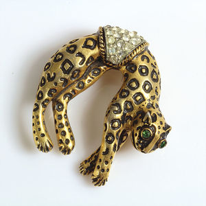 Goldfarbene Brosche unsigniert. Klarer Strassbesatz. Plastische Darstellung eines Tigers. Ähnlich wie TRIFARI, ca. 83,5 x 35,5 mm