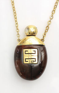 Parfumflacon an Kette, signiert: GIVENCHY PARIS.NEW YORK 1978, Metall vergoldet, Kunststoffläschchen mit Drehverschluß, L = 75,5 cm