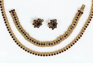 Lot: 3 Teile Metall goldfarben, schwarzer Strass: 1 x Armband mit Kastenschloß, L = 18,5 cm; 1 x Collier, L = 47 cm mit Verlängerungskettchen, 1 x Ohrclips D = 17,5 mm