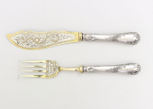 Fischvorlegebesteck um 1900, Silber 800/000, Klinge und Zinken teilweise feuervergoldet und mit feiner Ätzgravur verziert, L = 26 - 28,5 cm, Griffe mit Druckstellen