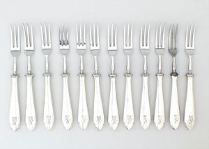 Eßbesteck 37 Teile: WELLNER 1. Hälfte 20.Jhd., Auflage 100, formschönes Besteck mit Monogramm: S, 6 x Kaffeelöffel L = 14,5 cm, 6 x Kuchengabeln L = 15 cm, 5 x Obstmesser L = 17,5cm, 6 x Dessertgabeln L = 17,8 cm, 6 x Dessertmesser l = 20,8 cm, 6 x Löffel L = 21 cm, 2 x kl. Vorlegegabel L = 18,2 cm