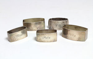 Lot: 5 Stück, Serviettenringe 1920er Jahre, Silber 800/000 u. 835/000, mit Monogramm / Namensgravur, total 96 g