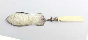 Fischtranchierbesteck um 1900, versilbert, gerillte Elfenbeingriffe, Klinge und Heber durchbrochen und graviert, L = 24 u. 32 cm