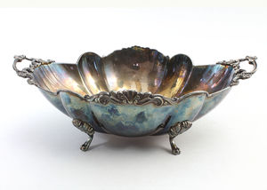 Schale, ITALIEN 2. Hälfte 20. Jhd., Silber 800/000, Schale stehend auf 4 Füßen, seitlich 2 verzierte Griffe, H = 8,2 cm, B = 25,5 cm, totol 322 g