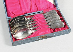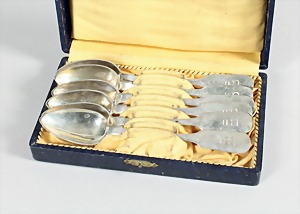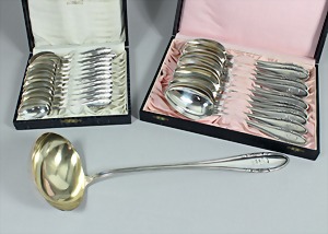 diverses Eßbesteck, WILKENS, SILBER 800/000, alle mit Monogramm: JFD, 12 x Eßlöffel, L = 21,3 cm, total 650 g; Suppenkelle, L = 34,5 cm, 206 g; 6 x Kaffelöffel, L = 14,2 cm, total 237 g, beide Löffelsätze in Originalschatulle