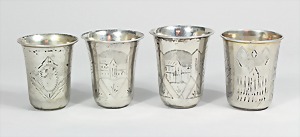 Lot: 4 Becher, Polen 1920er Jahre, JUDEIKA-Becher, Silber, gravierte ausdruckstarke Ornamentik, H = 64,5 -68,0 mm, total 132,0 g