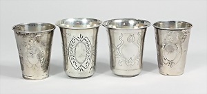 Lot: 4 Becher, Polen 1920er Jahre, JUDEIKA-Becher, Silber, gravierte Ornamentik, H = 59,5 - 62,0 mm, total 127,0 g