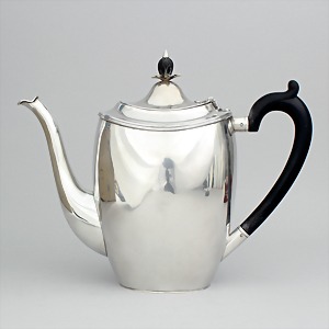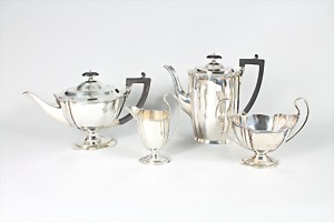 4 tlg. Englisches Tee-Kaffee Service SHEFFIELD 1918, Sterlingsilber, wohl W. HUTTON & SONS Ltd., ruhige Grundformen mit leicht verspieltem wellenförmigen Band als Abschluß, Teekanne mit schön geschwungenem Ausguss, H = 15,5 cm; Kaffeekanne mit leicht aufstrebender Form, H = 18,5, Deckelabschlüsse dkl. gebeiztes Holz, Griffe Kunststoff (alt), Zuckerschale H = 12,5 cm, Milchkännchen H = 13 cm, total ca.1500 g, Neupreis: € 2850,-