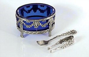 Gewürzsaliere um 1880/1900, Silber 800/000, kobaltblauer Glaseinsatz oben fein angefast, H = 40,0 mm; 1 x kl. Löffel Silber 835/00, L = 74,0 mm; 1 x kl. Zängchen, Silber 800/000, L = 47 mm (Löffel u. Zängchen später)